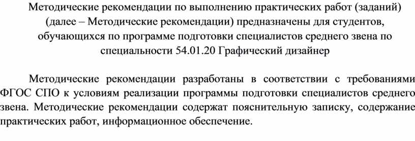 Методические рекомендации по выполнению практических работ (заданий) (далее – Методические рекомендации) предназначены для студентов, обучающихся по программе подготовки специалистов среднего звена по специальности 54.01.20 Графический дизайнер
