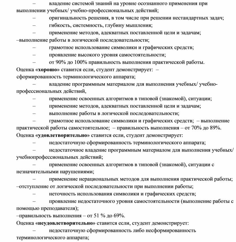 – грамотное использование символики и графических средств; – выполнение практической работы самостоятельное; – правильность выполнения – от 70% до 89%.