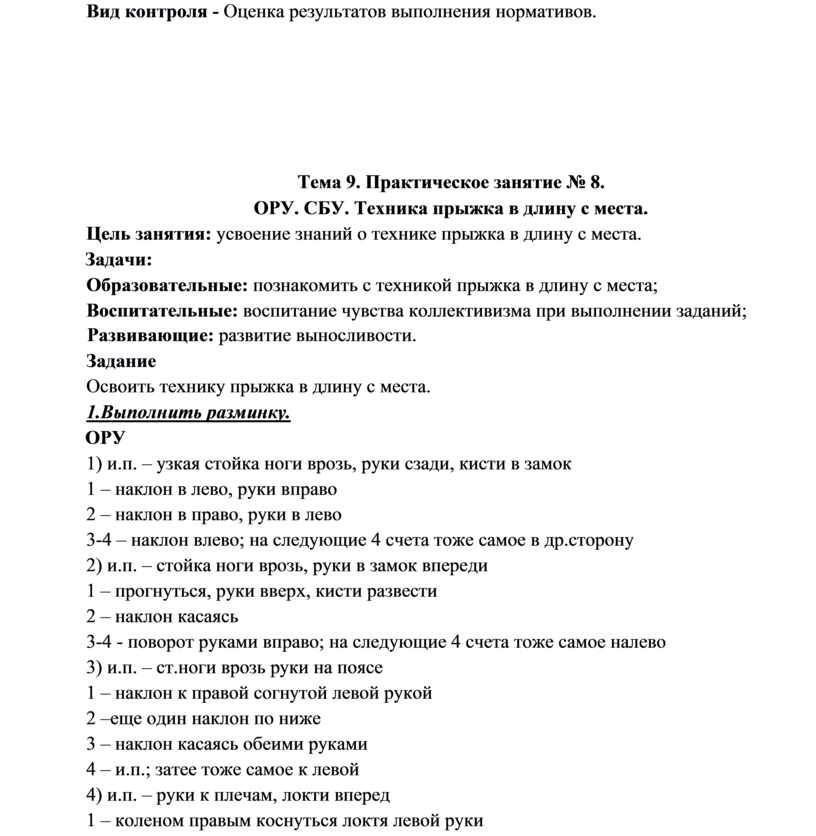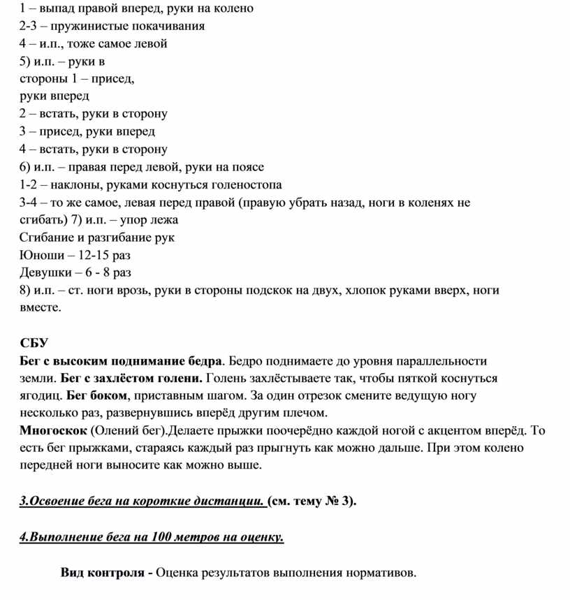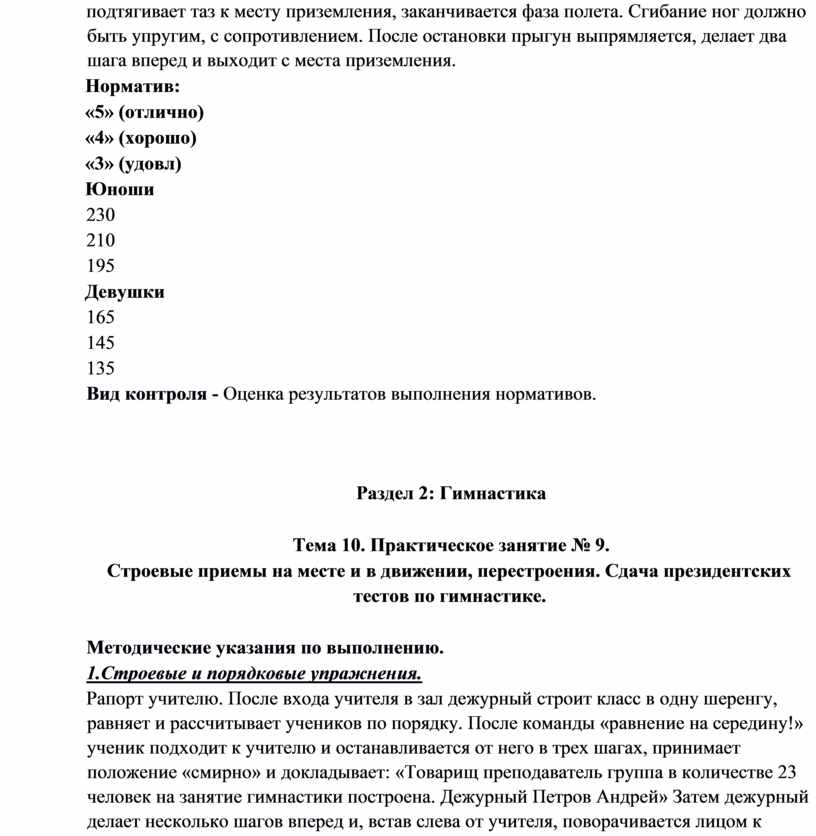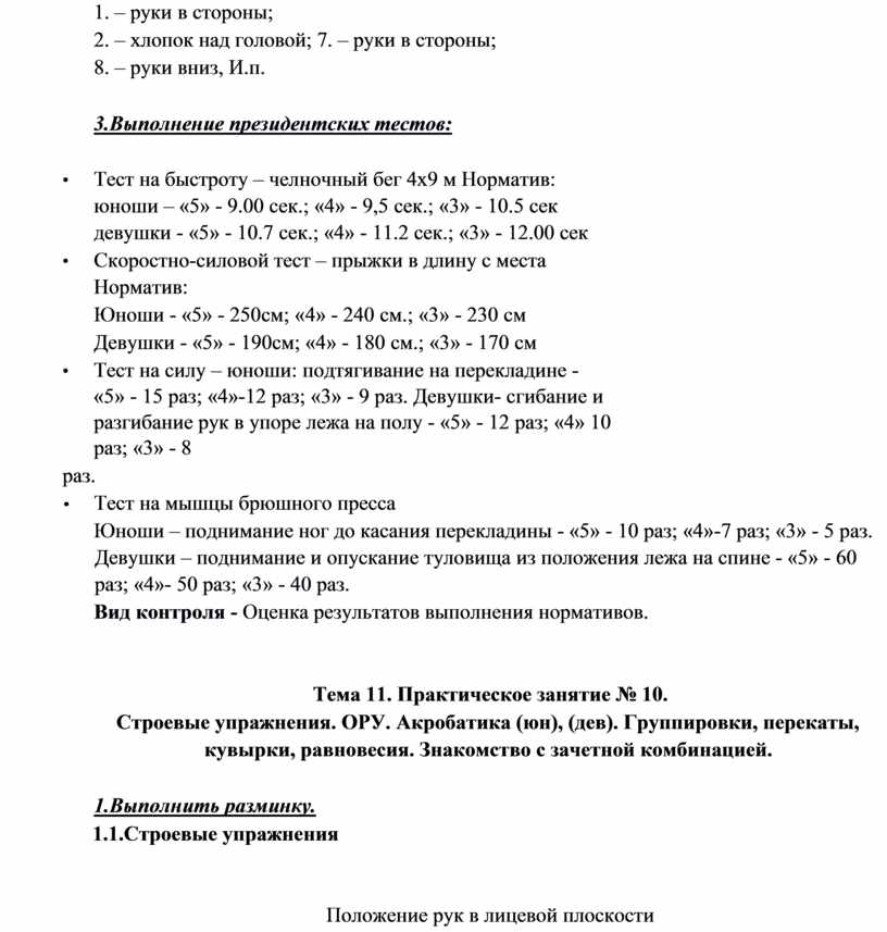 – выполнять контрольные нормативы, предусмотренные государственным стандартом при соответствующей тренировке, с учетом состояния здоровья и функциональных возможностей своего организма.