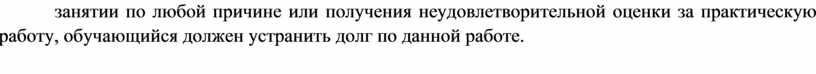 Наличие положительной оценки по практическим работам необходимо для успешного прохождения промежуточной аттестации по учебной дисциплине, поэтому в случае отсутствия на занятии по любой причине или получения неудовлетворительной оценки за практическую работу, обучающийся должен устранить долг по данной работе.