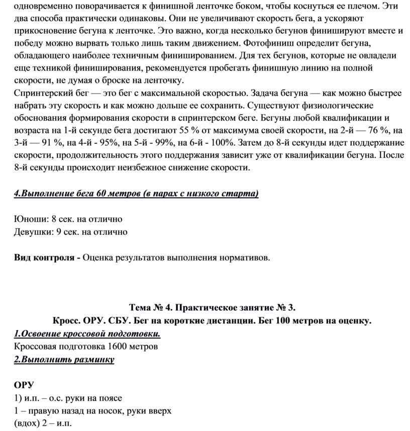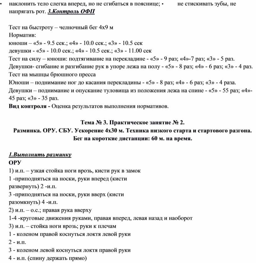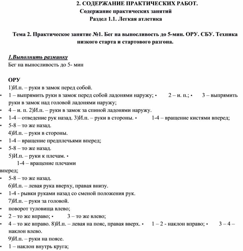 Тема 2. Практическое занятие №1. Бег на выносливость до 5-мин. ОРУ. СБУ. Техника низкого старта и стартового разгона.
