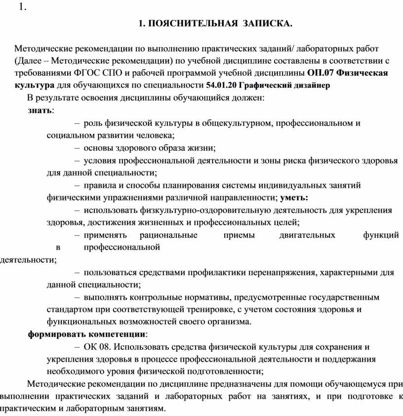 Методические рекомендации по выполнению практических заданий/ лабораторных работ (Далее – Методические рекомендации) по учебной дисциплине составлены в соответствии с требованиями ФГОС СПО и рабочей программой учебной дисциплины ОП.07 Физическая культура для обучающихся по специальности 54.01.20 Графический дизайнер