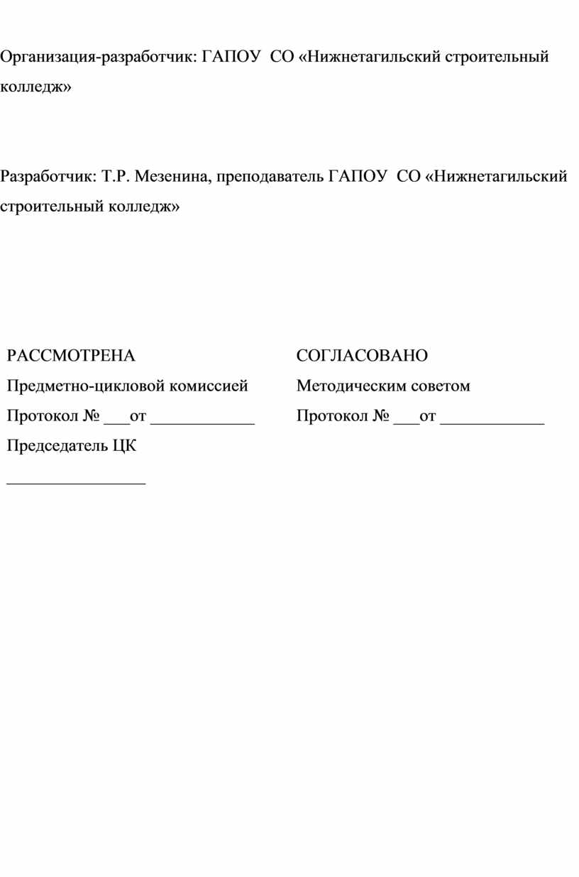 Разработчик: Т.Р. Мезенина, преподаватель ГАПОУ СО «Нижнетагильский строительный колледж»
