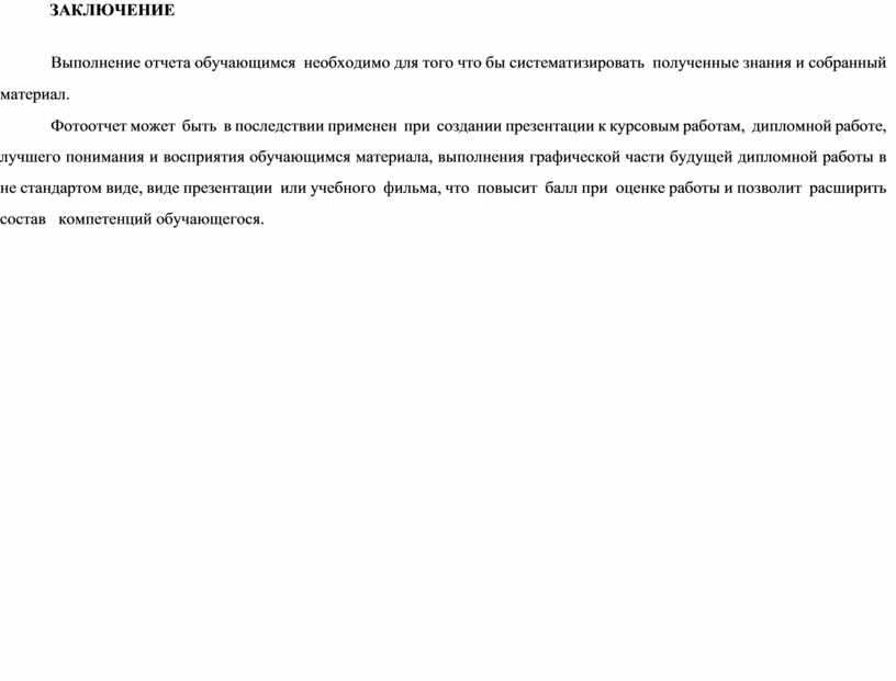 Фотоотчет может быть в последствии применен при создании презентации к курсовым работам, дипломной работе, лучшего понимания и восприятия обучающимся материала, выполнения графической части будущей дипломной работы в не стандартом виде, виде презентации или учебного фильма, что повысит балл при оценке работы и позволит расширить состав компетенций обучающегося.