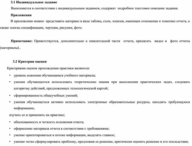 В результате прохождения практики обучающийся должен закрепить имеющиеся и получить навыки профессиональной деятельности, в соответствии с темами занятий и методическими рекомендациями по практическим работам по учебной практике, выполнить комплексную квалификационную работу, затем составить отчет по индивидуальному заданию, содержание отчета должно соответствовать принятым в колледже «Требованиям к оформлению текстовых документов».