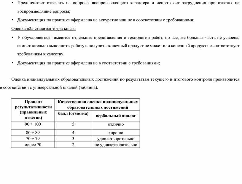 • Обучающийся обнаруживает освоение технологического процесса, но испытывает затруднения при его самостоятельном воспроизведении и требует дополнительных указаний наставника, конечный продукт получает с отклонениями от требований к качеству;