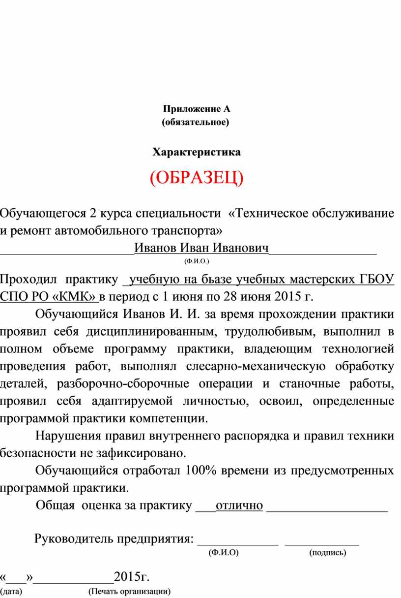 Обучающийся Иванов И. И. за время прохождении практики проявил себя дисциплинированным, трудолюбивым, выполнил в полном объеме программу практики, владеющим технологией проведения работ, выполнял слесарно-механическую обработку деталей, разборочно-сборочные операции и станочные работы, проявил себя адаптируемой личностью, освоил, определенные программой практики компетенции.