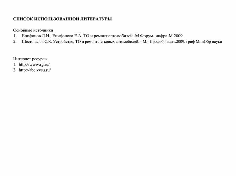 1. Епифанов Л.И., Епифанова Е.А. ТО и ремонт автомобилей.-М.Форум- инфра-М.2009.