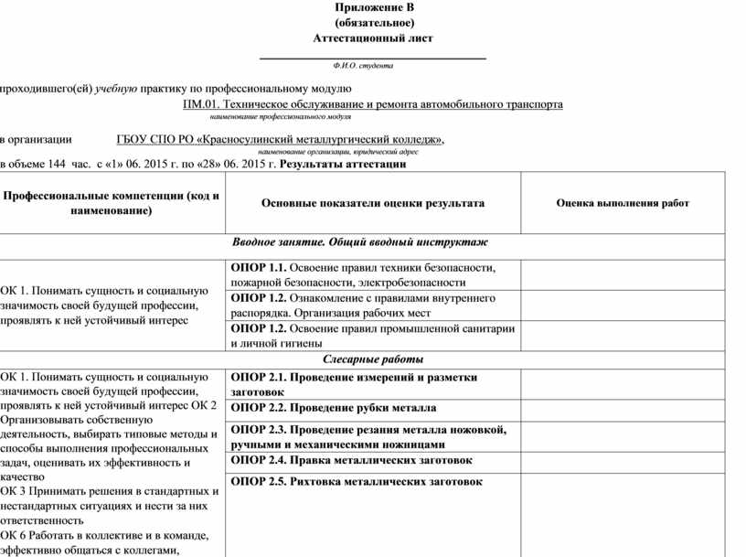 ПРИЛОЖЕНИЕ В АТТЕСТАЦИОННЫЙ ЛИСТ 16