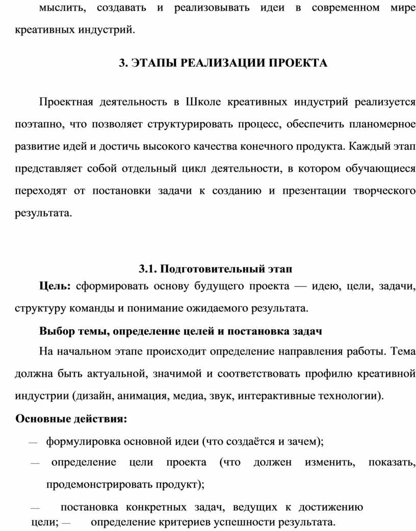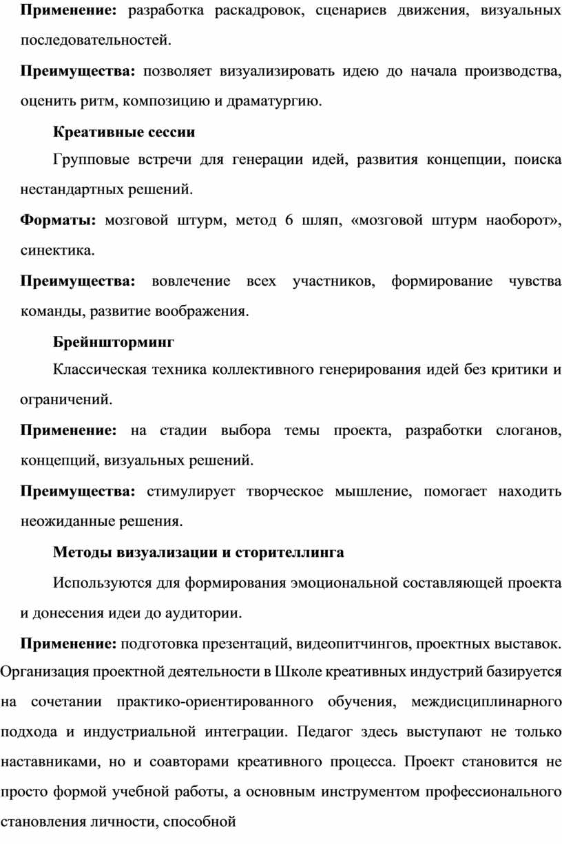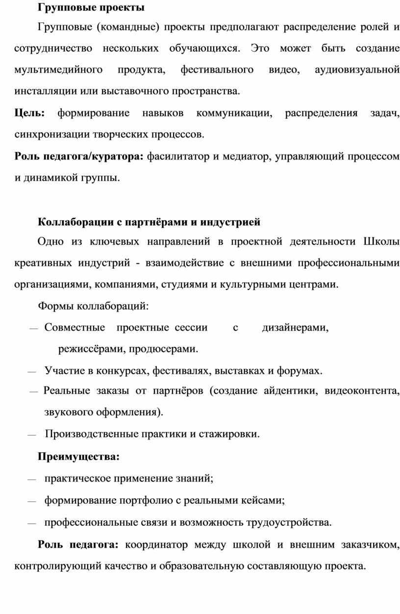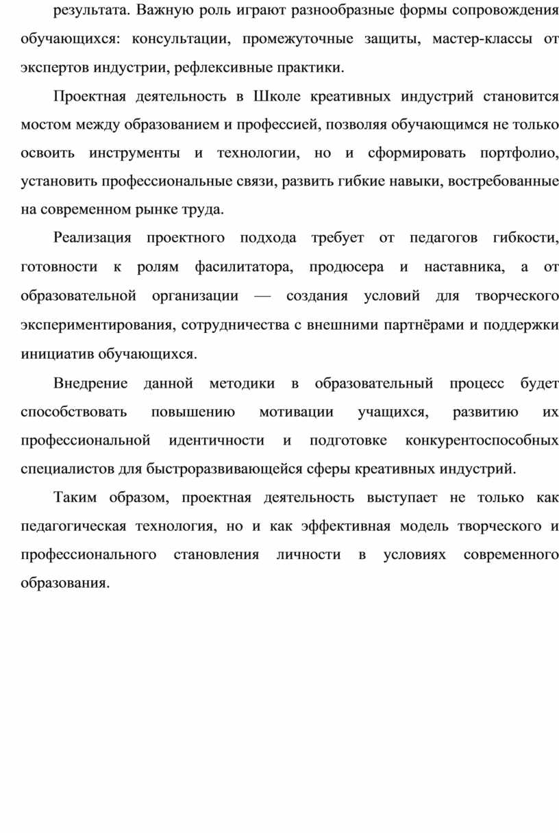 Кроме того, проектный подход отвечает современным требованиям рынка труда, где ценятся инициативность, способность к самостоятельному поиску решений и умение реализовывать идеи от замысла до результата. В Школе креативных индустрий проектная деятельность выступает не только педагогической технологией, но и формой творческого самовыражения, профессиональной подготовки и социализации обучающихся.