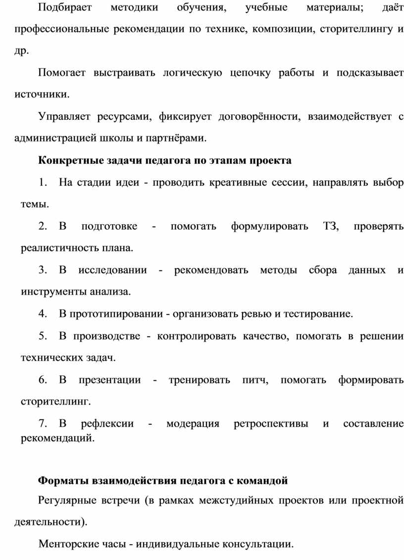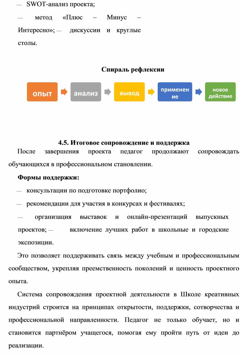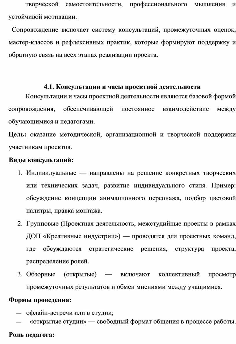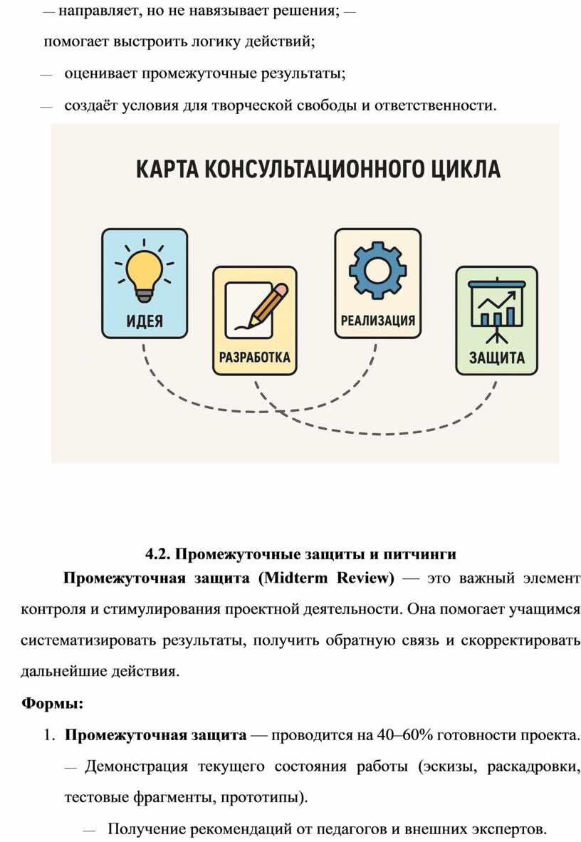 4. Предложить формы и методы сопровождения проектной работы, включая консультации, промежуточные защиты, кураторство и рефлексию.
