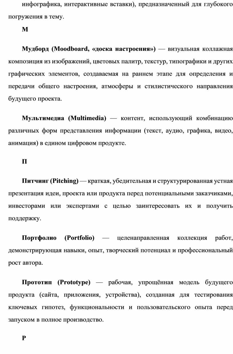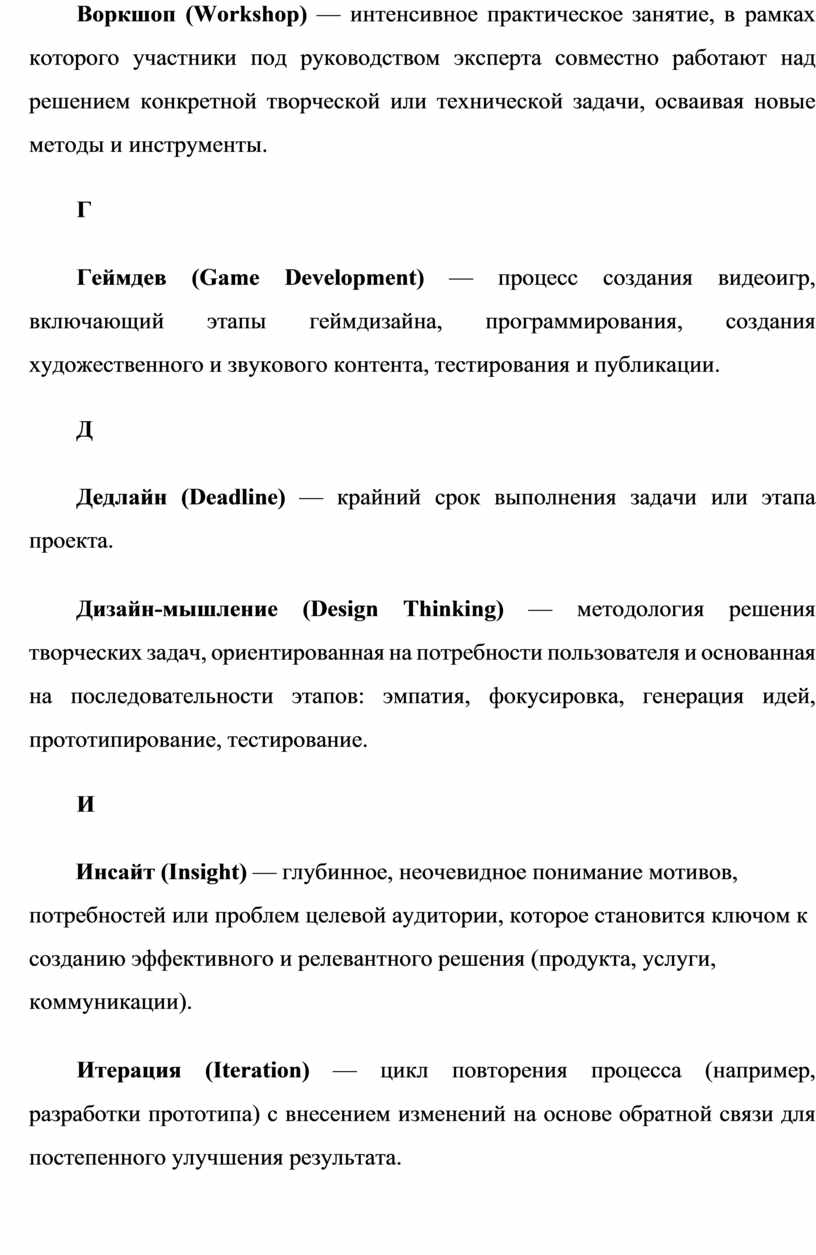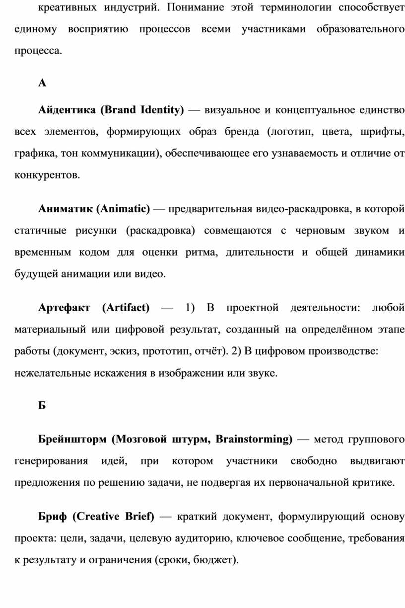 Настоящий глоссарий содержит определения ключевых терминов, используемых в методическом пособии и в проектной практике Школы креативных индустрий. Понимание этой терминологии способствует единому восприятию процессов всеми участниками образовательного процесса.