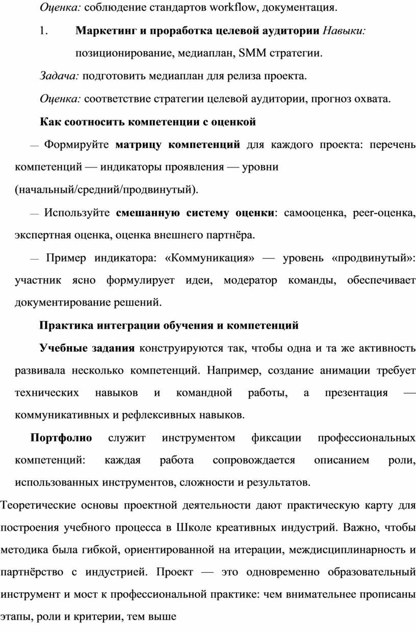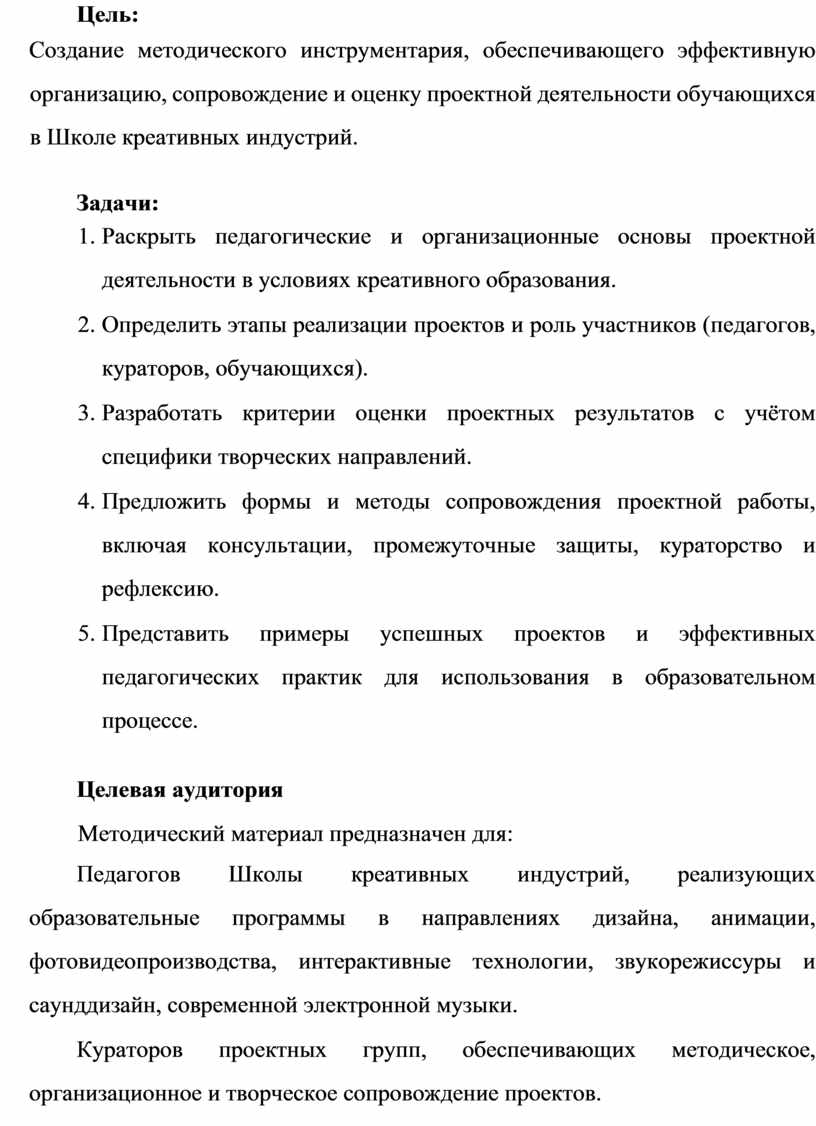 Создание методического инструментария, обеспечивающего эффективную организацию, сопровождение и оценку проектной деятельности обучающихся в Школе креативных индустрий.