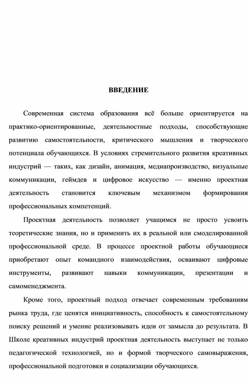 Современная система образования всё больше ориентируется на практико-ориентированные, деятельностные подходы, способствующие развитию самостоятельности, критического мышления и творческого потенциала обучающихся. В условиях стремительного развития креативных индустрий — таких, как дизайн, анимация, медиапроизводство, визуальные коммуникации, геймдев и цифровое искусство — именно проектная деятельность становится ключевым механизмом формирования профессиональных компетенций.