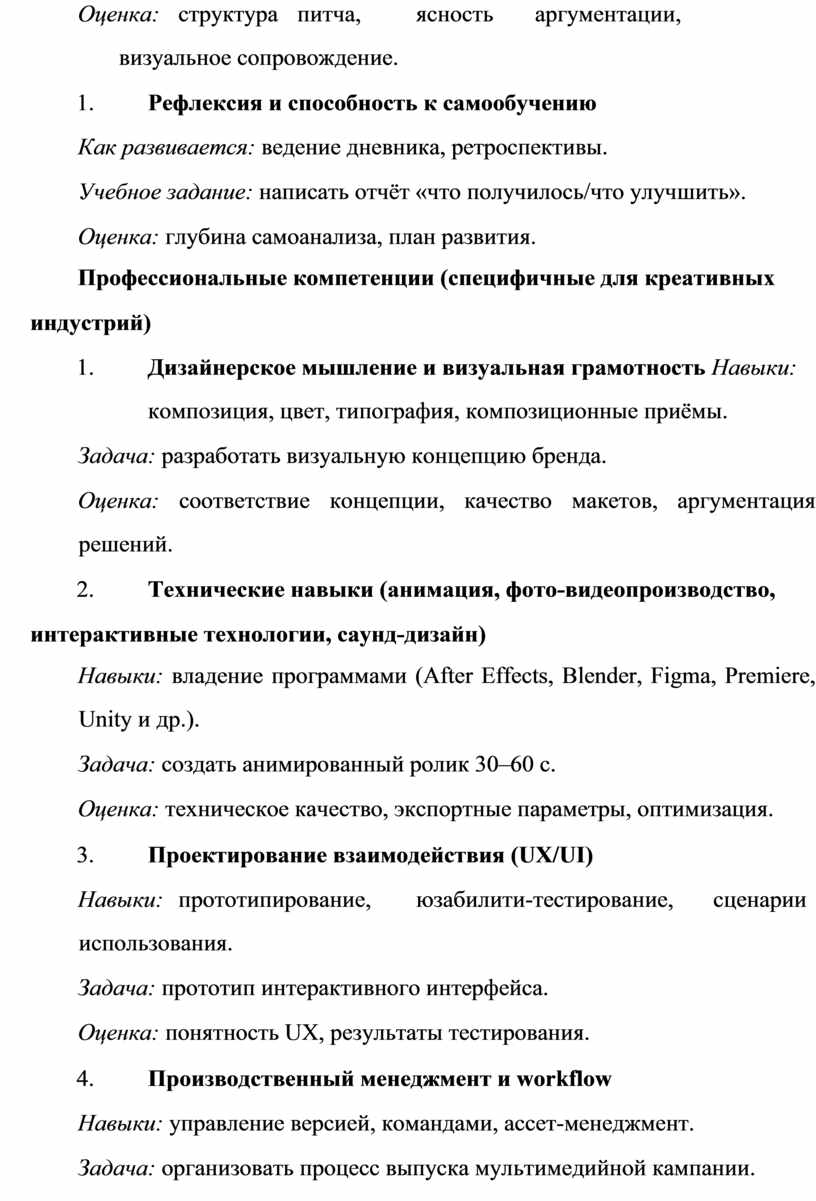 4. Интердисциплинарность – интеграция знаний из разных областей (дизайн, анимация, звук, медиа, программирование и др.), что отражает специфику креативных индустрий.