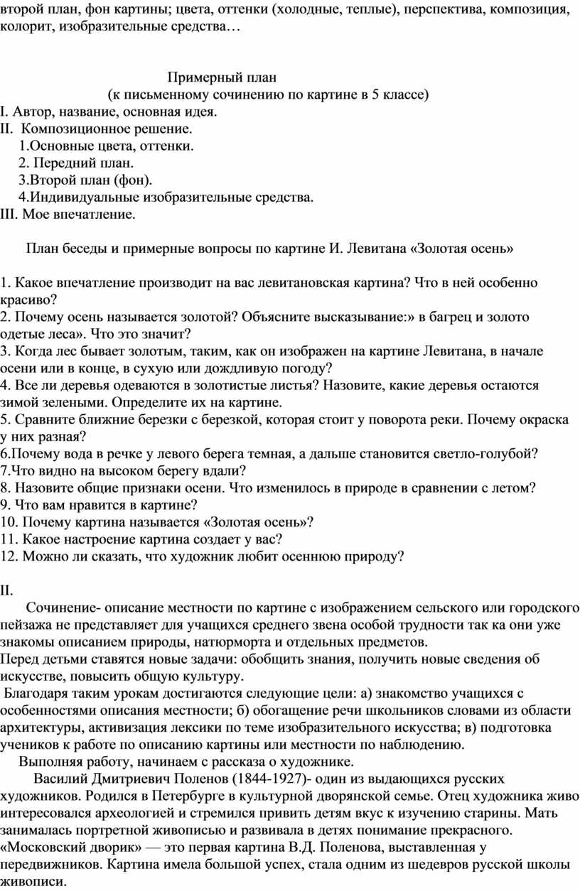 Сочинение- описание местности по картине с изображением сельского или городского пейзажа не представляет для учащихся среднего звена особой трудности так ка они уже знакомы описанием природы, натюрморта и отдельных предметов.