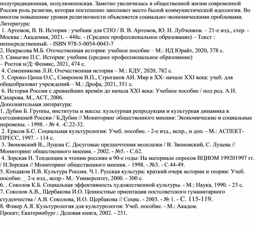 1. Артемов, В. В. История : учебник для СПО / В. В. Артемов, Ю. Н. Лубченков. – 21-е изд., стер. - Москва : Академия, 2021. - 448с. - (Среднее профессиональное образование) – Текст : непосредственный. - ISBN 978-5-0054-0043-7