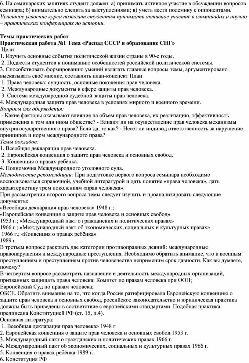 Практическая работа (семинар) – важный вид учебной работы, способствующий успешному усвоению студентом курса истории. В части данных методических указаний вниманию студентов предлагаются требования к подготовке семинарских занятий, темы, планы, списки литературы. В приложении помещен список основной и дополнительной литературы ко всему курсу.