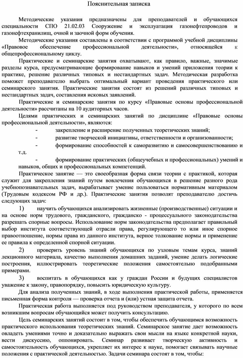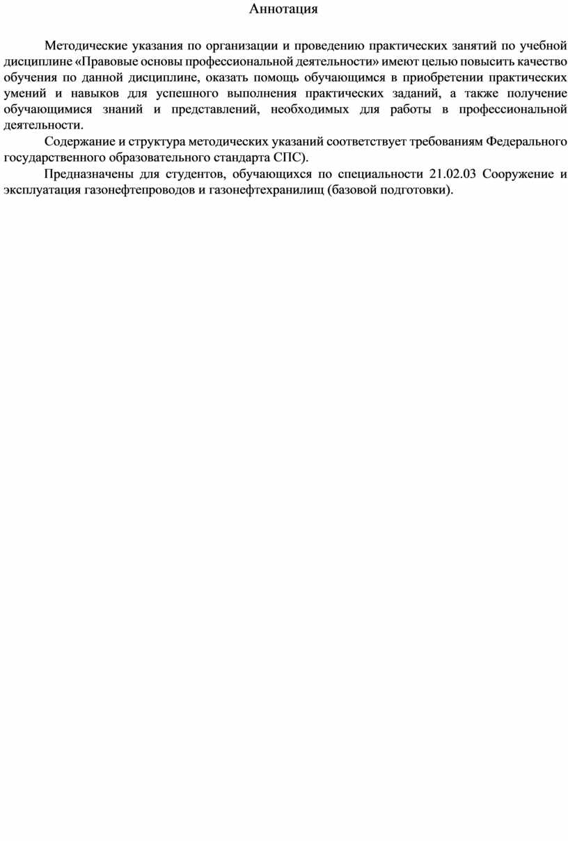 Методические указания по организации и проведению практических занятий по учебной дисциплине «Правовые основы профессиональной деятельности» имеют целью повысить качество обучения по данной дисциплине, оказать помощь обучающимся в приобретении практических умений и навыков для успешного выполнения практических заданий, а также получение обучающимися знаний и представлений, необходимых для работы в профессиональной деятельности.