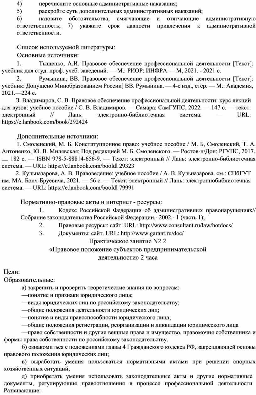 1.Тыщенко, А.И. Правовое обеспечение профессиональной деятельности [Текст]: учебник для студ. проф. учеб. заведений. — М.: РИОР: ИНФРА — М, 2021. - 2021 с.