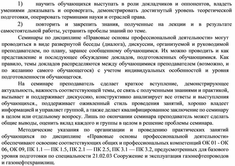 Семинары по дисциплине «Правовые основы профессиональной деятельности» могут проводиться в виде развернутой беседы (диалога), дискуссии, организуемой и руководимой преподавателем, по плану, заранее сообщенному обучающимся. Их можно проводить и как представление и последующее обсуждение докладов, подготовленных обучающимися. Как правило, темы докладов распределяются между обучающимися преподавателем (возможно, и по желанию самого обучающегося) с учетом индивидуальных особенностей и уровня подготовленности обучающегося.