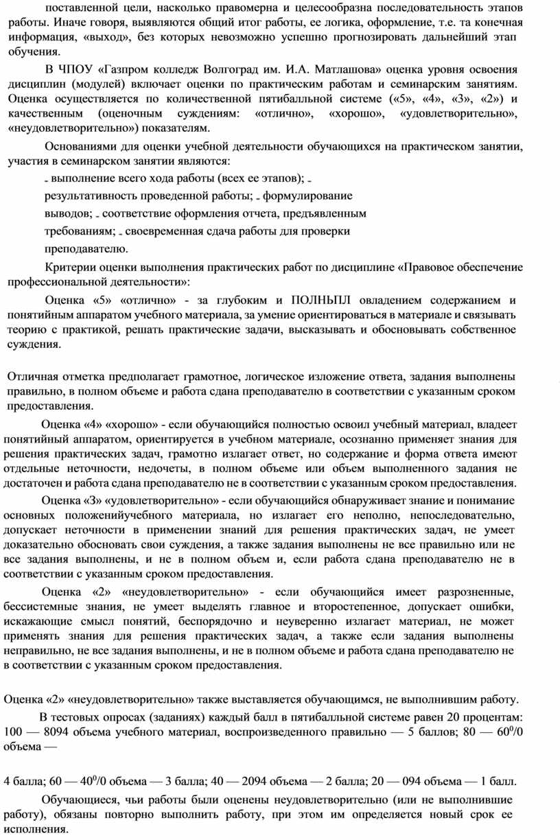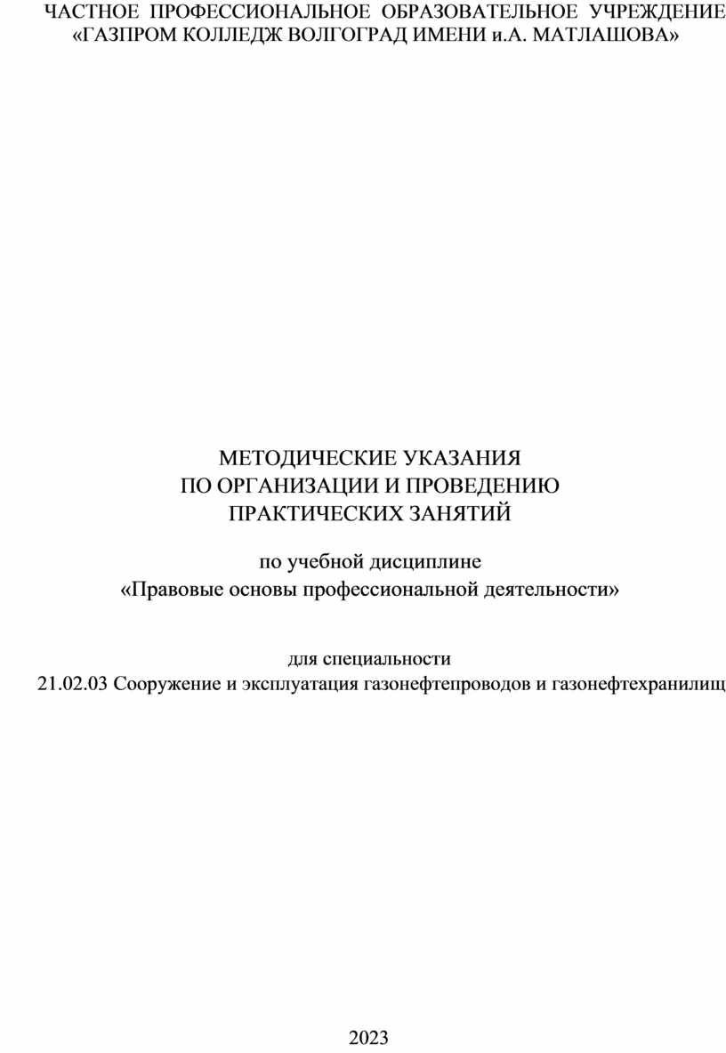 Методические указания по организации и проведению практических занятий разработаны на основании рабочей программы учебной дисциплины «Правовые основы профессиональной деятельности >>, утвержденной 04.09.2023, в соответствии с Положением о практической подготовке при организации и проведении практических занятий, лабораторных работ в ЧПОУ «Газпром колледж Волгоград им. И.А. Матлашова»
