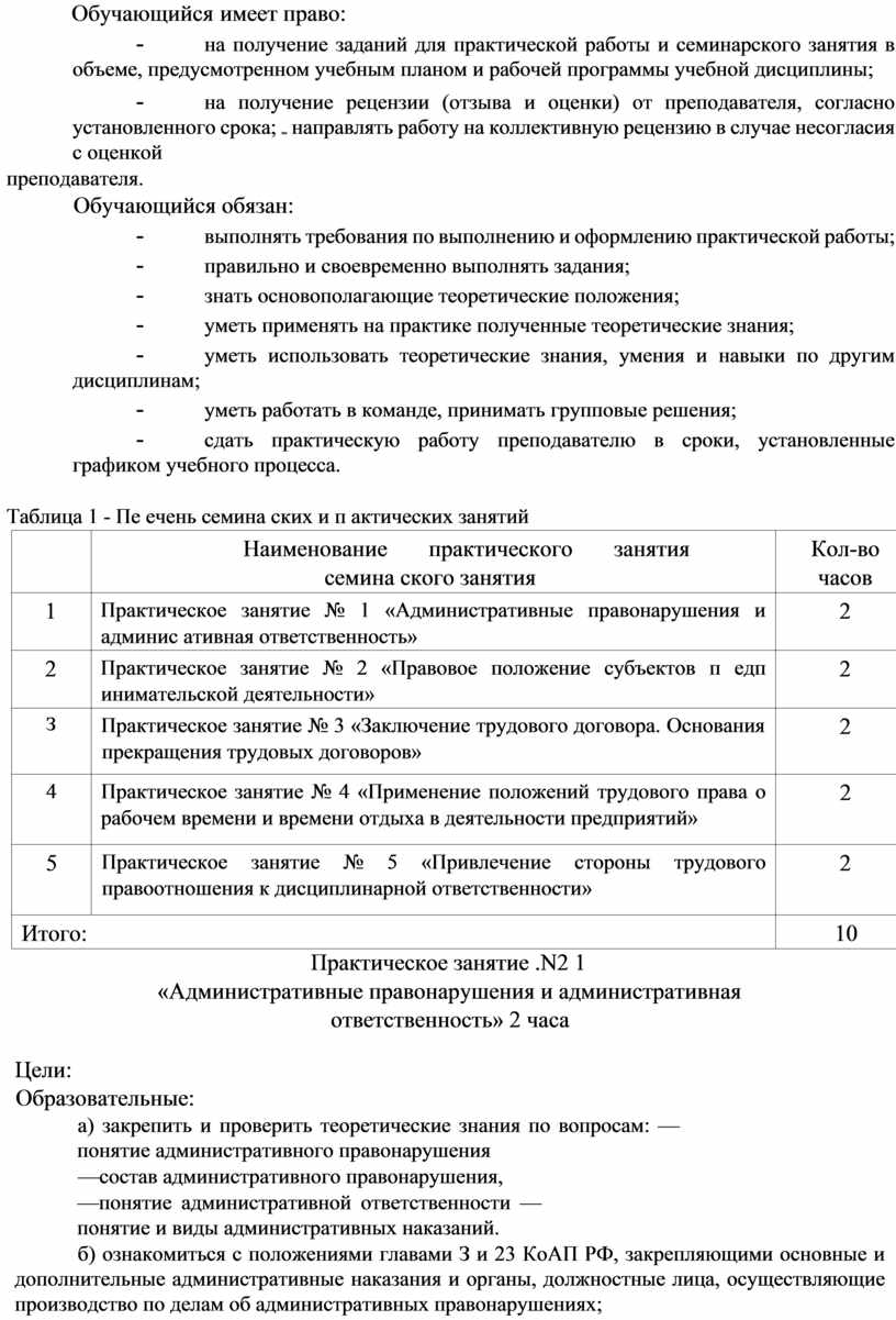 Практические и семинарские занятия по курсу «Правовые основы профессиональной деятельности» рассчитаны на 10 аудиторных часов.