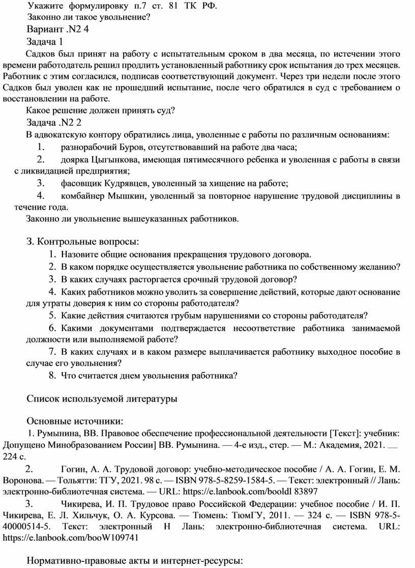 4. Гогин, А. А. Трудовой договор: учебно-методическое пособие / А. А. Гогин, Е. М. Воронова. — Тольятти: ТГУ, 2021 98 с. — ISBN 978-5-8259-1584-5. — Текст: электронный // Лань: электронно-библиотечная система. — URL: https://e.lanbook.com/book/183897
