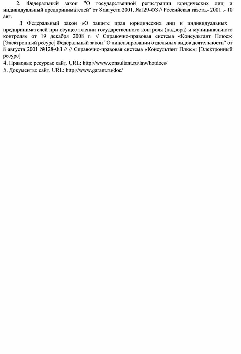 7. Федеральный закон государственной регистрации юридических лиц и индивидуальный предпринимателей“ от 8 августа 2001.№129-ФЗ // Российская газета.- 2001 10 авг.;