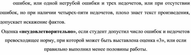 Оценка «удовлетворительно», если студент правильно выполнил не менее половины работы или допустил не более двух грубых ошибок, или не более одной грубой и одной негрубой ошибки и одного недочета, или не более двух-трех негрубых ошибок, или одной негрубой ошибки и трех недочетов, или при отсутствии ошибок, но при наличии четырех-пяти недочетов, плохо знает текст произведения, допускает искажение фактов.