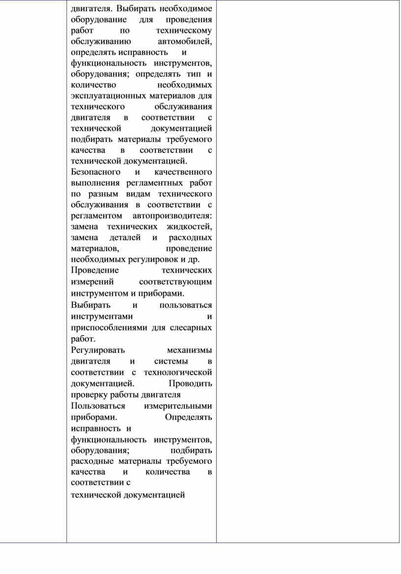 двигателя. Выбирать необходимое оборудование для проведения работ по техническому обслуживанию автомобилей, определять исправность и функциональность инструментов, оборудования; определять тип и количество необходимых эксплуатационных материалов для технического обслуживания двигателя в соответствии с технической документацией подбирать материалы требуемого качества в соответствии с технической документацией. Безопасного и качественного выполнения регламентных работ по разным видам технического обслуживания в соответствии с регламентом автопроизводителя: замена технических жидкостей, замена деталей и расходных материалов, проведение необходимых регулировок и др. Проведение технических измерений соответствующим инструментом и приборами. Выбирать и пользоваться инструментами и приспособлениями для слесарных работ. Регулировать механизмы двигателя и системы в соответствии с технологической документацией. Проводить проверку работы двигателя Пользоваться измерительными приборами. Определять исправность и функциональность инструментов, оборудования; подбирать расходные материалы требуемого качества и количества в соответствии с технической документацией
