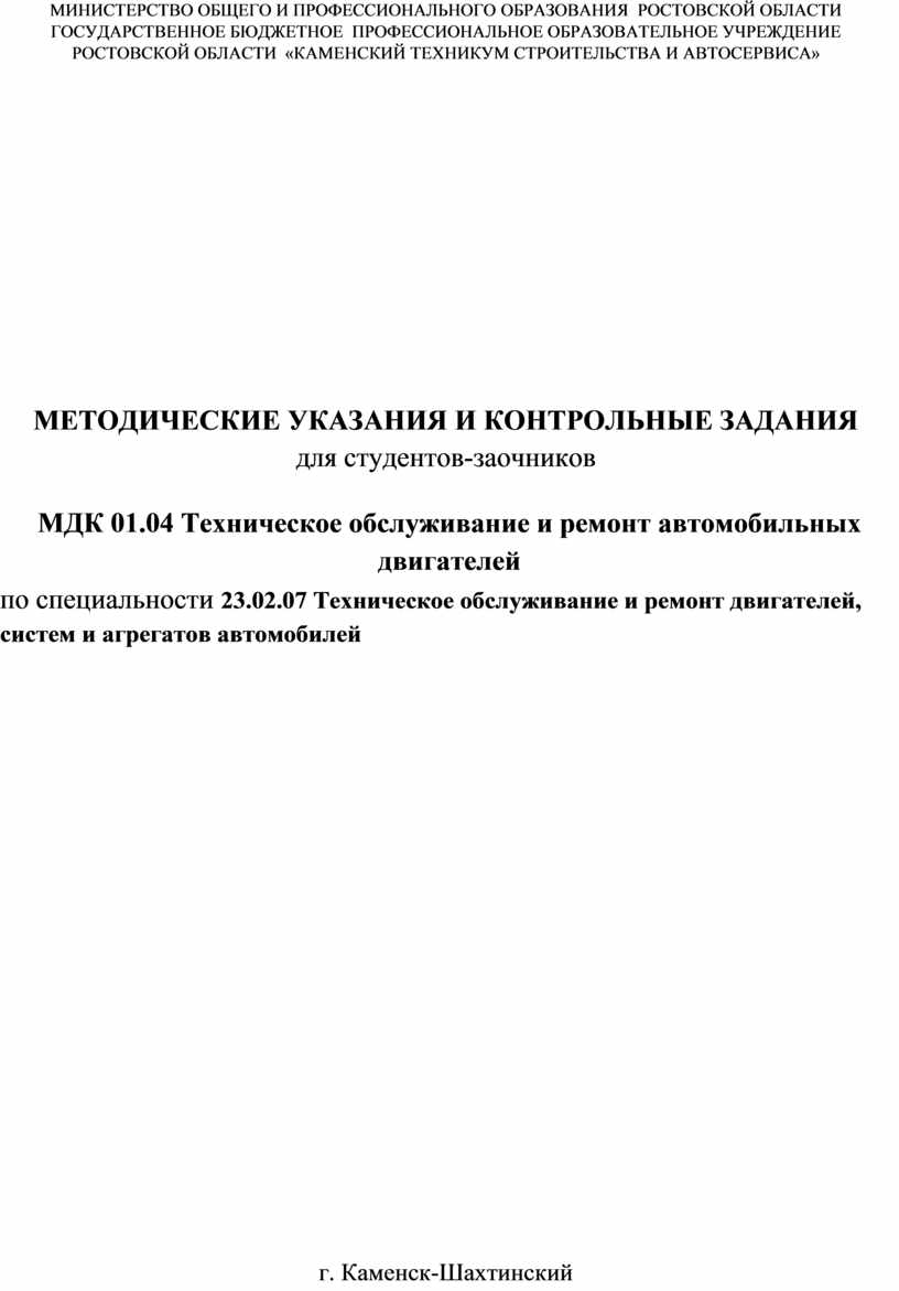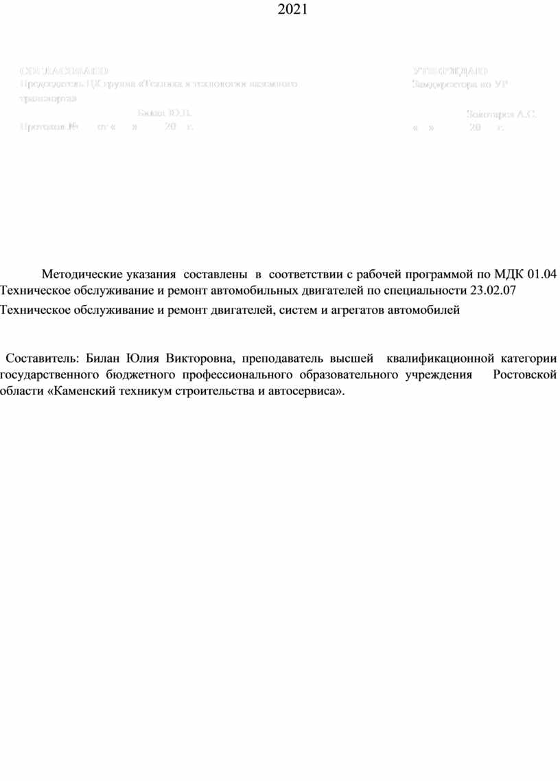 Методические указания составлены в соответствии с рабочей программой по МДК 01.04 Техническое обслуживание и ремонт автомобильных двигателей по специальности 23.02.07