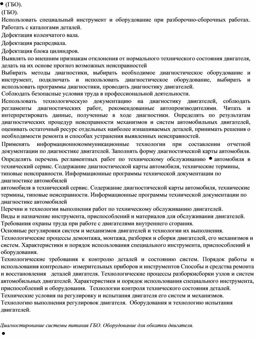 (ГБО). Использовать специальный инструмент и оборудование при разборочно-сборочных работах. Работать с каталогами деталей. Дефектация коленчатого вала. Дефектация распредвала. Дефектация блока цилиндров. Выявлять по внешним признакам отклонения от нормального технического состояния двигателя, делать на их основе прогноз возможных неисправностей Выбирать методы диагностики, выбирать необходимое диагностическое оборудование и инструмент, подключать и использовать диагностическое оборудование, выбирать и использовать программы диагностики, проводить диагностику двигателей. Соблюдать безопасные условия труда в профессиональной деятельности. Использовать технологическую документацию на диагностику двигателей, соблюдать регламенты диагностических работ, рекомендованные автопроизводителями. Читать и интерпретировать данные, полученные в ходе диагностики. Определять по результатам диагностических процедур неисправности механизмов и систем автомобильных двигателей, оценивать остаточный ресурс отдельных наиболее изнашиваемых деталей, принимать решения о необходимости ремонта и способах устранения выявленных неисправностей. Применять информационнокоммуникационные технологии при составлении отчетной документации по диагностике двигателей. Заполнять форму диагностической карты автомобиля. Определять перечень регламентных работ по техническому обслуживанию |