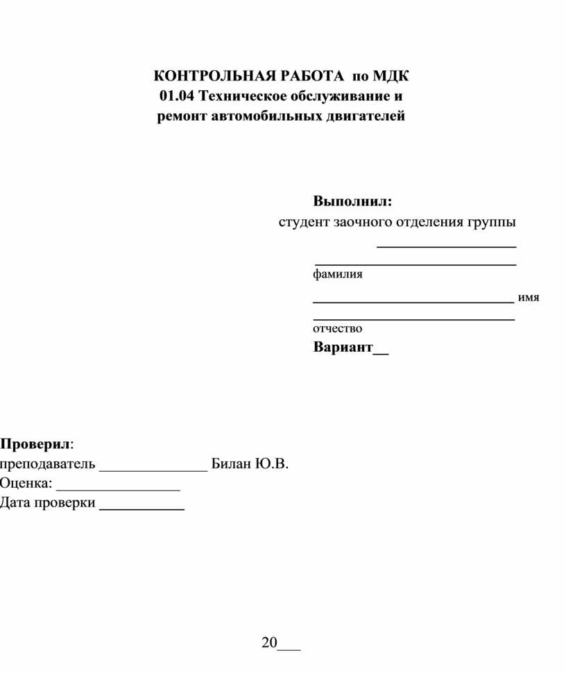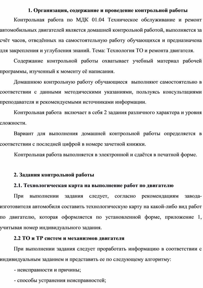 Контрольная работа по МДК 01.04 Техническое обслуживание и ремонт автомобильных двигателей является домашней контрольной работой, выполняется за счёт часов, отведённых на самостоятельную работу обучающихся и предназначена для закрепления и углубления знаний. Тема: Технология ТО и ремонта двигателя.