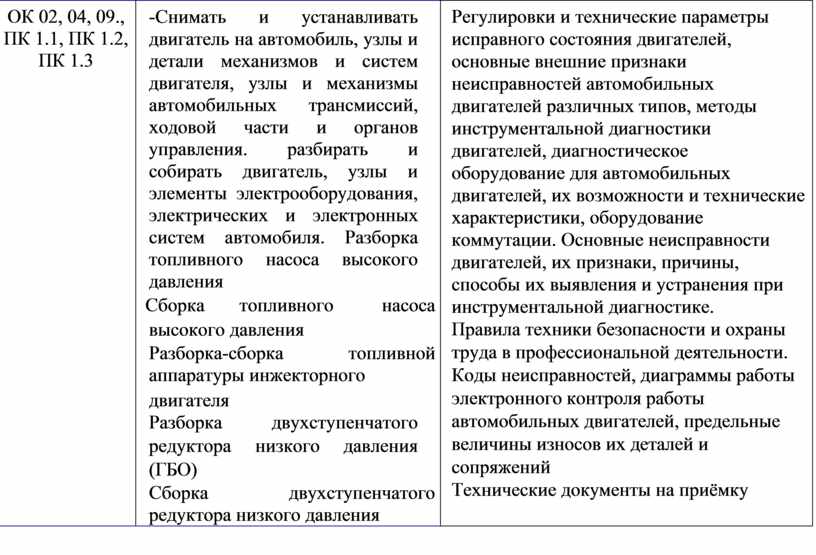 Регулировки и технические параметры исправного состояния двигателей, основные внешние признаки неисправностей автомобильных двигателей различных типов, методы инструментальной диагностики двигателей, диагностическое оборудование для автомобильных двигателей, их возможности и технические характеристики, оборудование коммутации. Основные неисправности двигателей, их признаки, причины, способы их выявления и устранения при инструментальной диагностике. Правила техники безопасности и охраны труда в профессиональной деятельности. Коды неисправностей, диаграммы работы электронного контроля работы автомобильных двигателей, предельные величины износов их деталей и сопряжений Технические документы на приёмку |