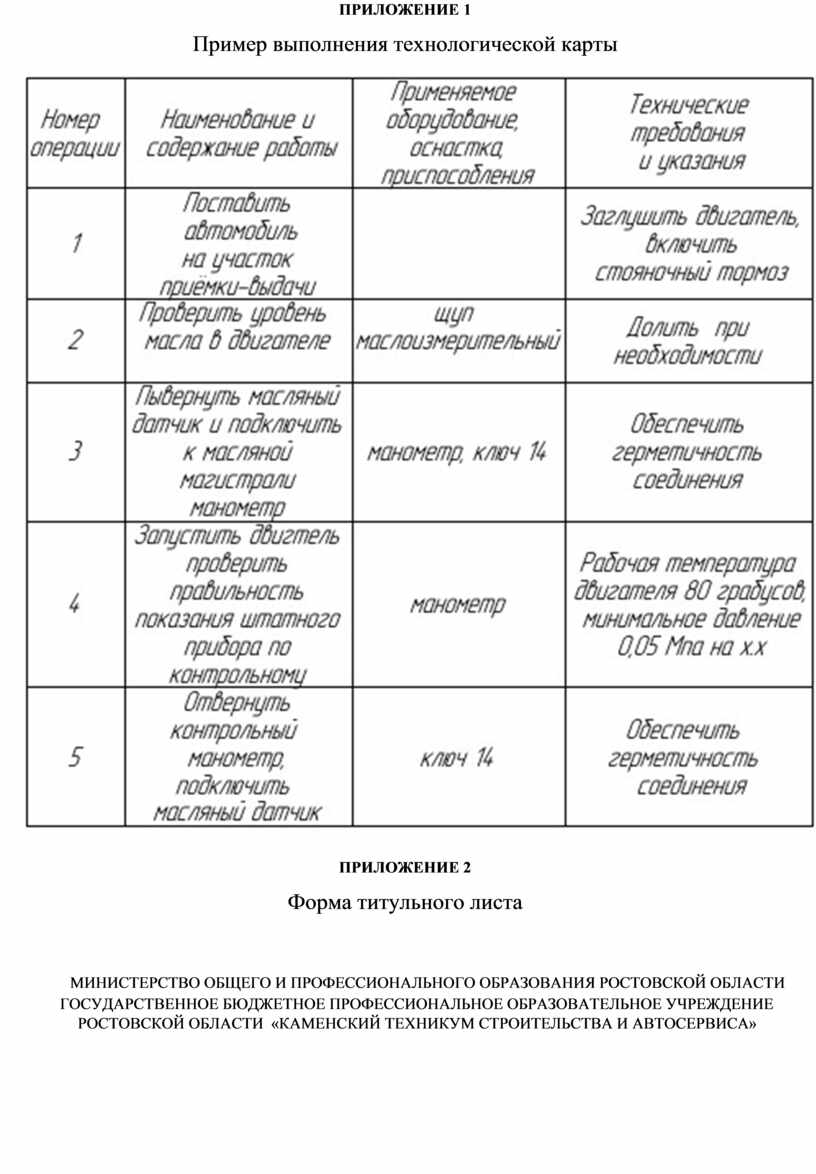 При выполнении задания следует, согласно рекомендациям завода- изготовителя автомобиля составить технологическую карту на какой-либо вид работ по двигателю, которая оформляется по установленной форме, приложение 1, учитывая номер индивидуального задания.