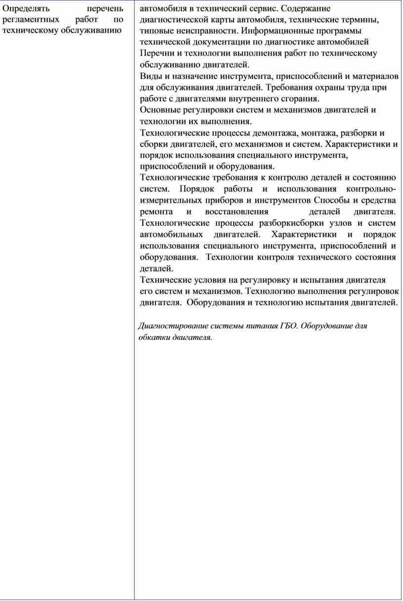 автомобиля в технический сервис. Содержание диагностической карты автомобиля, технические термины, типовые неисправности. Информационные программы технической документации по диагностике автомобилей Перечни и технологии выполнения работ по техническому обслуживанию двигателей. Виды и назначение инструмента, приспособлений и материалов для обслуживания двигателей. Требования охраны труда при работе с двигателями внутреннего сгорания. Основные регулировки систем и механизмов двигателей и технологии их выполнения. Технологические процессы демонтажа, монтажа, разборки и сборки двигателей, его механизмов и систем. Характеристики и порядок использования специального инструмента, приспособлений и оборудования. Технологические требования к контролю деталей и состоянию систем. Порядок работы и использования контрольно- измерительных приборов и инструментов Способы и средства ремонта и восстановления деталей двигателя. Технологические процессы разборкисборки узлов и систем автомобильных двигателей. Характеристики и порядок использования специального инструмента, приспособлений и оборудования. Технологии контроля технического состояния деталей. Технические условия на регулировку и испытания двигателя его систем и механизмов. Технологию выполнения регулировок двигателя. Оборудования и технологию испытания двигателей.