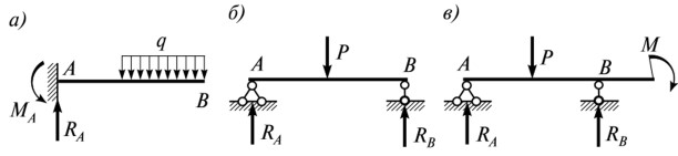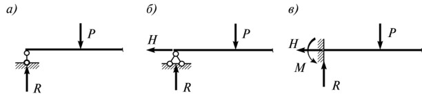 Жесткая заделка (рис. 5, в) не допускает поворота и линейных перемещений закрепленного конца балки. В жесткой заделке могут возникнуть три опорные реакции, например вертикальная R, горизонтальная Н и реактивный момент М.