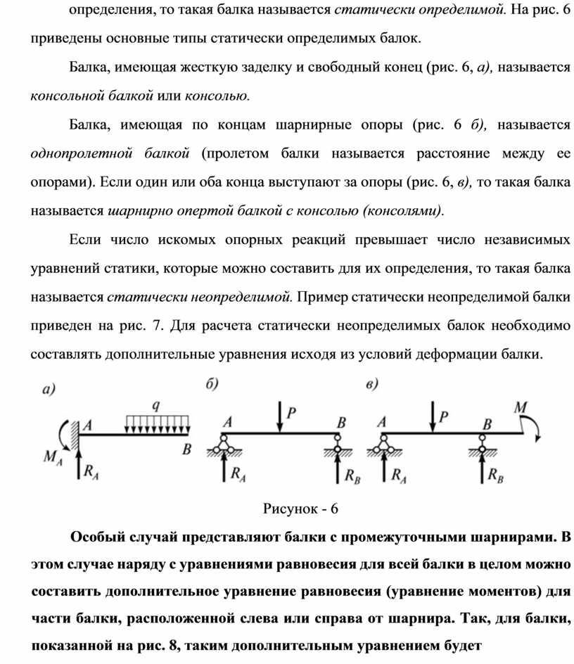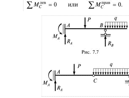 Особый случай представляют балки с промежуточными шарнирами. В этом случае наряду с уравнениями равновесия для всей балки в целом можно составить дополнительное уравнение равновесия (уравнение моментов) для части балки, расположенной слева или справа от шарнира. Так, для балки, показанной на рис. 8, таким дополнительным уравнением будет