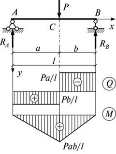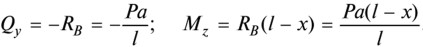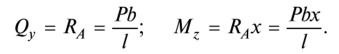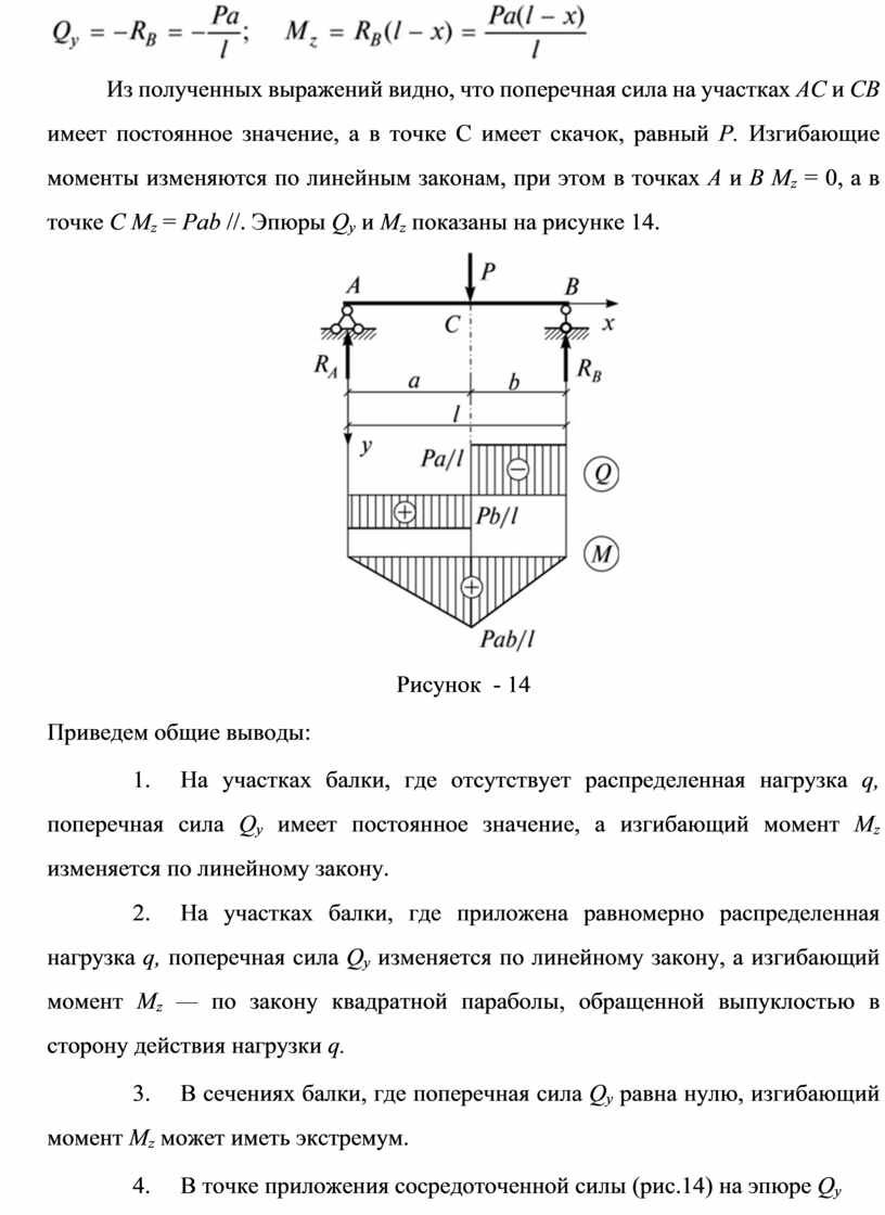 Из полученных выражений видно, что поперечная сила на участках АС и СВ имеет постоянное значение, а в точке С имеет скачок, равный Р. Изгибающие моменты изменяются по линейным законам, при этом в точках А и В Mz = 0, а в точке С Mz = Pab //. Эпюры Qy и Mz показаны на рисунке 14.