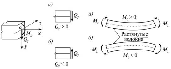 При плоском прямом изгибе в плоскости Оху в поперечных сечениях балки возникают два внутренних усилия: поперечная сила Qy и изгибающий момент Mz (рис. 9). Эти усилия являются равнодействующими сил взаимодействия между частями балки, т.е. напряжений в проведенном сечении. Продольная сила N равна нулю.
