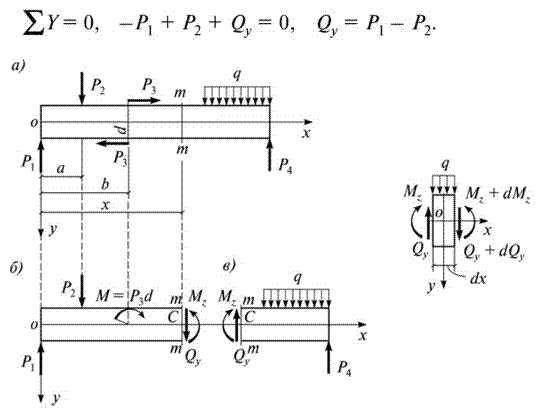Для определения внутренних усилий используется метод сечений. Определим, например, поперечную силу и изгибающий момент в сечении т—т балки (рис. 12, а), находящейся в равновесии под действием произвольных поперечных нагрузок. Для этого мысленно разрежем балку плоскостью, перпендикулярной к ее оси, отбросим одну из частей (например, правую часть). Влияние отброшенной части заменим действием в этом сечении двух внутренних усилий — поперечной силы Qy и изгибающего момента Mz (рис. 12, б).
