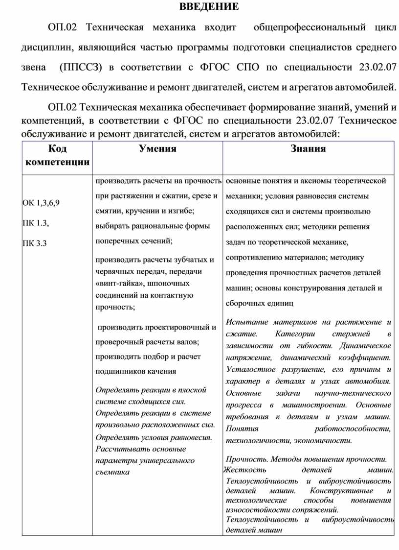 ОП.02 Техническая механика обеспечивает формирование знаний, умений и компетенций, в соответствии с ФГОС по специальности 23.02.07 Техническое обслуживание и ремонт двигателей, систем и агрегатов автомобилей: