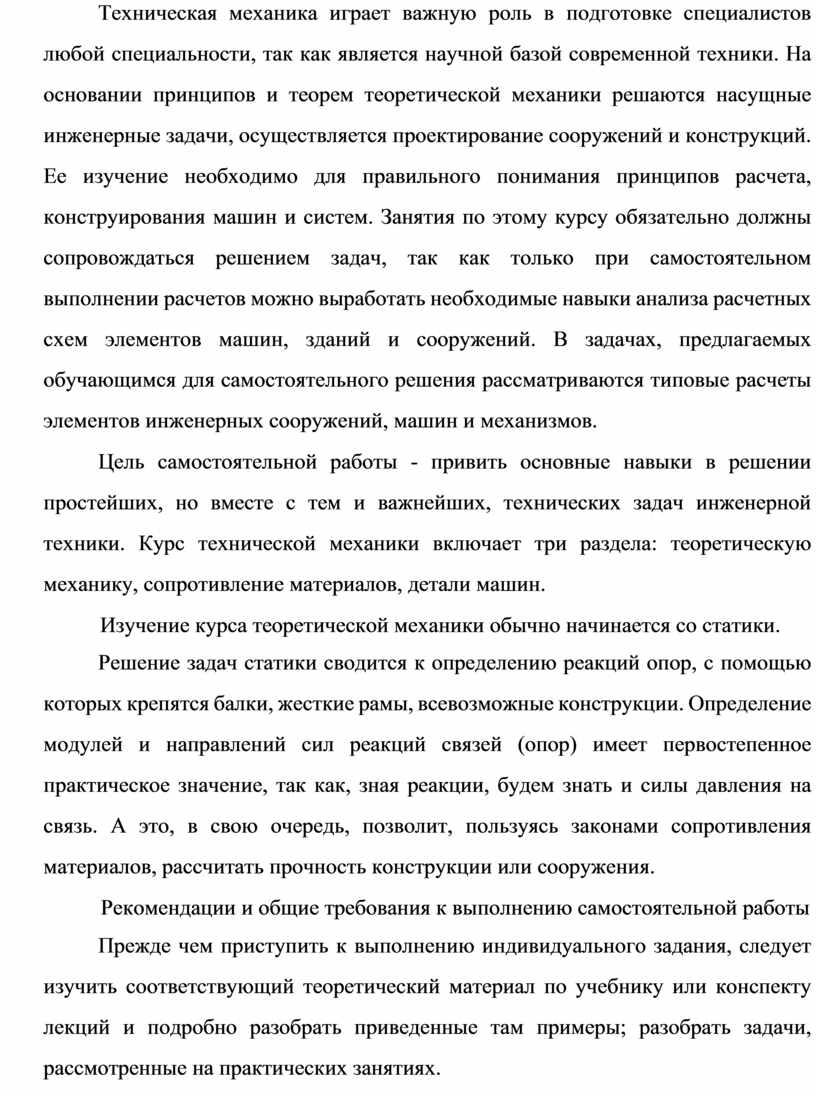 Техническая механика играет важную роль в подготовке специалистов любой специальности, так как является научной базой современной техники. На основании принципов и теорем теоретической механики решаются насущные инженерные задачи, осуществляется проектирование сооружений и конструкций. Ее изучение необходимо для правильного понимания принципов расчета, конструирования машин и систем. Занятия по этому курсу обязательно должны сопровождаться решением задач, так как только при самостоятельном выполнении расчетов можно выработать необходимые навыки анализа расчетных схем элементов машин, зданий и сооружений. В задачах, предлагаемых обучающимся для самостоятельного решения рассматриваются типовые расчеты элементов инженерных сооружений, машин и механизмов.