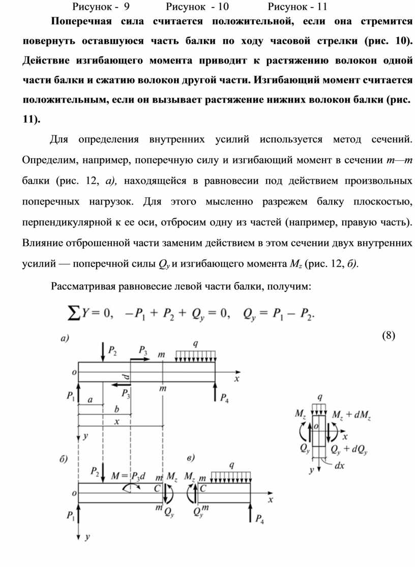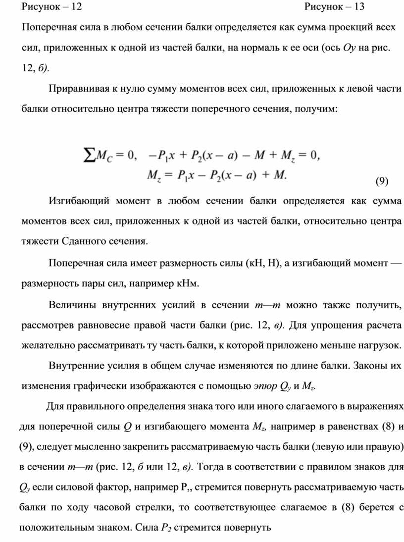 Рисунок – 12 Рисунок – 13 Поперечная сила в любом сечении балки определяется как сумма проекций всех сил, приложенных к одной из частей балки, на нормаль к ее оси (ось Оу на рис. 12, б).