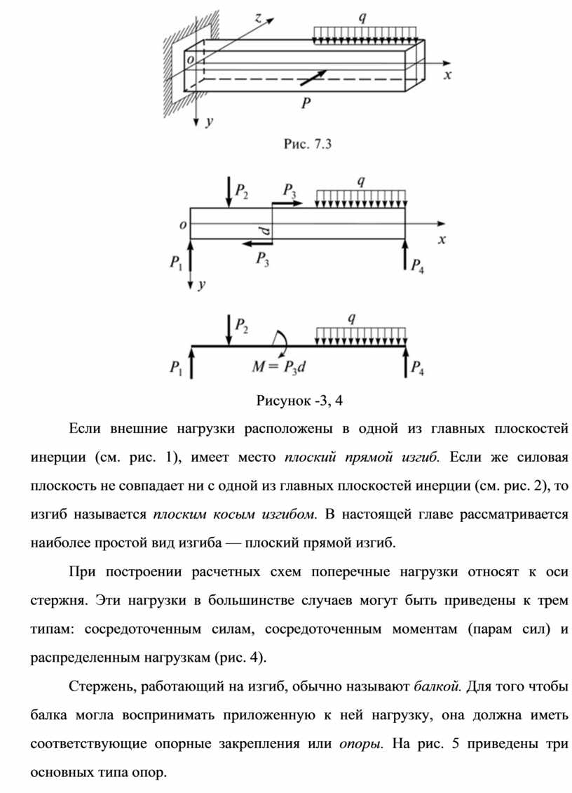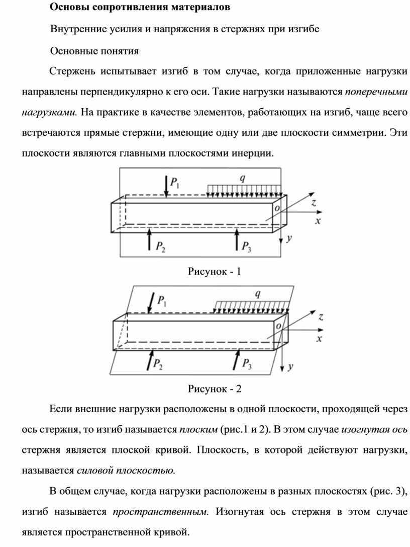 Стержень испытывает изгиб в том случае, когда приложенные нагрузки направлены перпендикулярно к его оси. Такие нагрузки называются поперечными нагрузками. На практике в качестве элементов, работающих на изгиб, чаще всего встречаются прямые стержни, имеющие одну или две плоскости симметрии. Эти плоскости являются главными плоскостями инерции.