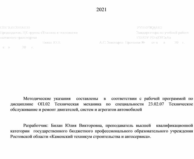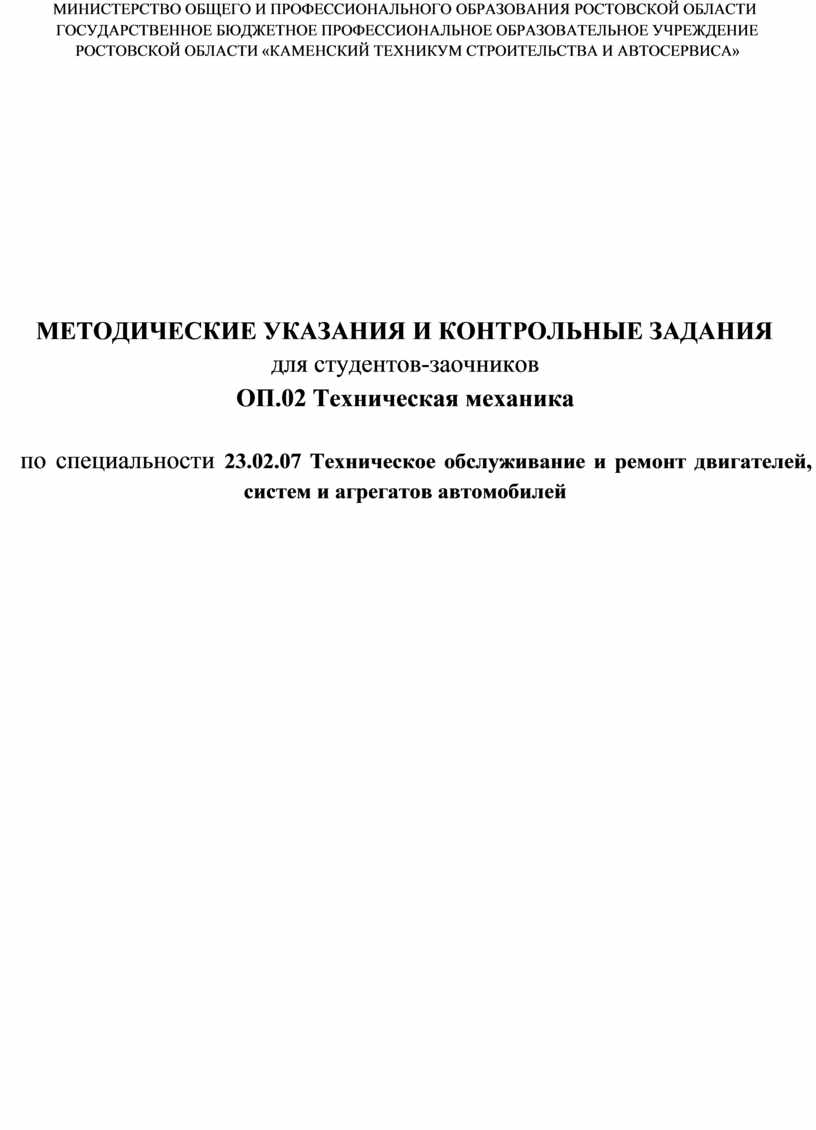 Методические указания составлены в соответствии с рабочей программой по дисциплине ОП.02 Техническая механика по специальности 23.02.07 Техническое обслуживание и ремонт двигателей, систем и агрегатов автомобилей