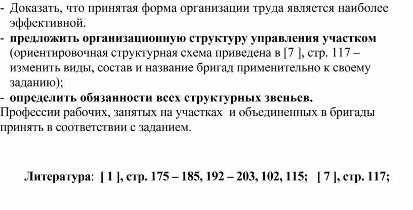 - предложить организационную структуру управления участком (ориентировочная структурная схема приведена в [7 ], стр. 117 – изменить виды, состав и название бригад применительно к своему заданию);