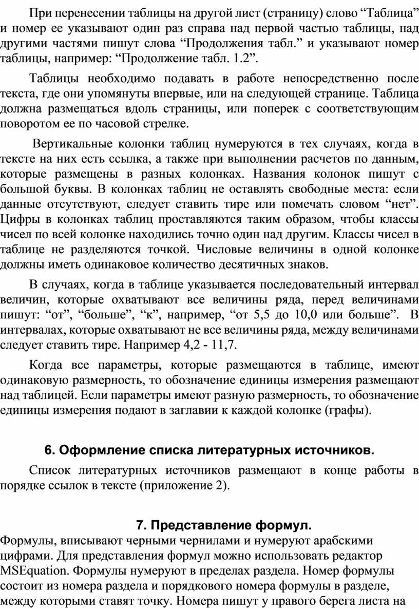 Вертикальные колонки таблиц нумеруются в тех случаях, когда в тексте на них есть ссылка, а также при выполнении расчетов по данным, которые размещены в разных колонках. Названия колонок пишут с большой буквы. В колонках таблиц не оставлять свободные места: если данные отсутствуют, следует ставить тире или помечать словом “нет”. Цифры в колонках таблиц проставляются таким образом, чтобы классы чисел по всей колонке находились точно один над другим. Классы чисел в таблице не разделяются точкой. Числовые величины в одной колонке должны иметь одинаковое количество десятичных знаков.