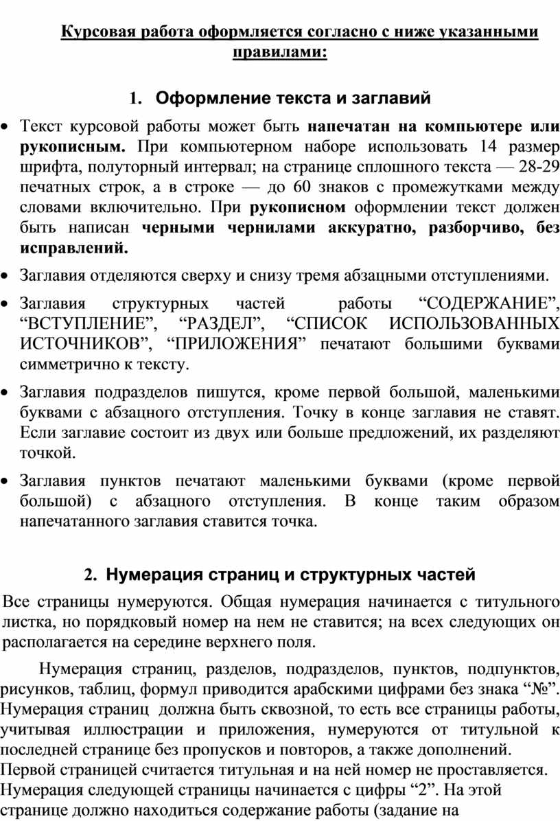 · Текст курсовой работы может быть напечатан на компьютере или рукописным. При компьютерном наборе использовать 14 размер шрифта, полуторный интервал; на странице сплошного текста — 28-29 печатных строк, а в строке — до 60 знаков с промежутками между словами включительно. При рукописном оформлении текст должен быть написан черными чернилами аккуратно, разборчиво, без исправлений.